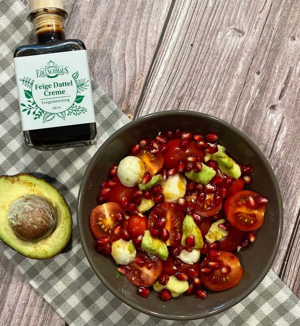 Die Mini-Mozzarellakugeln absieben. Tomaten, Avocado, Granatapfelkerne und Mozzarella in einer Schüssel vermischen.